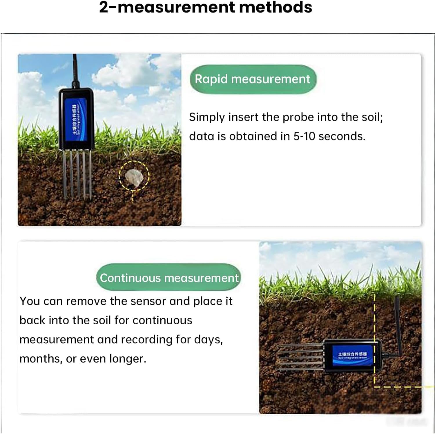 Product Advantages * High-density epoxy resin is used for high-temperature vacuum filling between the probe and the body, effectively preventing moisture from entering the internal structure and providing excellent sealing performance. * In addition to the connecting parts, the entire body has been treated with waterproofing and dustproofing to ensure long-term operation of the components. Product Parameters Name: Soil Analyzer Detection Functions: Nitrogen, Phosphorus, Potassium, pH, Humidity, Nutrients, Salinity, and Conductivity Product Dimensions: 141.6*48.3mm Packing List 1*Soil Tester